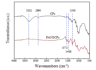 Structural analysis of the PANI / CFs electrode materials: FT-IR characterization of the CFs substrate and PANI / CFs electrode material structures by comparative analysis, as shown in Figure 12 at 1300cm in the infrared spectrum of the CFs substrate-1, 2890cm- 1 and 3322cm-1 dwell [18]. The C-H and-OH characteristic peaks of the molecular chains of cellulose in CFs appeared. However, in the IR spectrum of PANI / CFs, 2890cm-1 and 3322cm-1. The characteristic absorption peak of the cellulose molecular chain disappeared, 1572cm-1 and 1,488cm-1. The characteristic peak of polyaniline appears, and 1300cm-1. The characteristic peak at C-H was enhanced, indicating the successful generation of PANI on CFs.