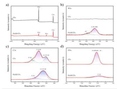 Figure 13:A) XPS full spectrum, b) C1s, c) N1s and d) O1s spectrum of CFs and PANI / CFs electrodes.