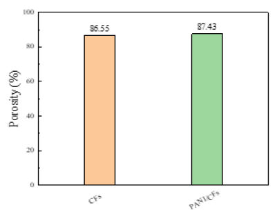 Porosity analysis of the PANI / CFs electrode material: The porosity can affect the electrochemical properties of the electrode material, and too low or too high porosity will cause mass transfer restriction or reduced energy density [8]. Figure 14 compares the porosity of CFs substrate and PANI / CFs electrode materials. As shown, the porosity of CFs substrate is 86.6% and PANI / CFs electrode material is 87.4%. The reasons for the increase in the porosity of PANI / CFs electrode materials: first, when the PANI is in situ polymerized on CFs, due to the shrinkage of fibers, the chemical binding of PANI and CFs leads to the rupture of a small number of cellulose molecules. After the pore increases, the contact between the electrode material and the electrolyte is increased to a certain extent, thus enhancing the electrochemical reaction