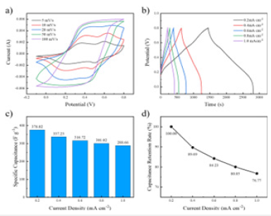 Electrochemical properties analysis of PANI / CFs electrode materials: To assess the multiplier ability of PANI / CFs electrode materials, PANI / CFs electrode materials were subjected to CV testing using different scanning rates. As shown in Figure 15a, as the scan rates 5,10,20,50 and 100mV / s increase. Figure 15b shows the GCD curve of PANI / CFs electrode materials at different current densities. As shown in Figure, with the gradual increase of current density, the charge and discharge time of the GCD curve gradually shortened and maintains symmetry, indicating its superior electrochemical reversibility. In order to more intuitively observe the multiplier performance of PANI / CFs electrode materials, as shown in Figure 15c-d, when the current density is 0.2mAccm-2. Then, the specific capacitance of the electrode material was calculated as 3 76 .02Fg-1. With the current density to 1mAccm-2, The capacitance retention rate of the electrode material was 76.77%.
