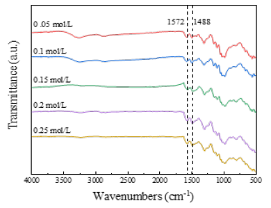 Morphological structure and electrical conductivity of PANI / CFs electrode materials: In the process of PANI synthesis by chemical oxidation method, ANI monomer participates in the reaction as an important substrate, and the molar ratio with APS greatly affects the yield and performance of PANI. Figure 5 shows the FT-IR plot of the PANI / CFs electrode material prepared with different concentrations of ANI, as shown at 1572cm at an ANI concentration of 0.05mol/L-1(Quinone-type structure), 1,488cm-1 The characteristic absorption vibration peak of PANI at (benzene structure) is not obvious. This is because when the APS concentration is certain and the ANI concentration is too low, the chain growth reaction of the PANI polymer chain is unfavorable. The characteristic absorption vibration peak of PANI was significantly enhanced with the increasing ANI concentration in the system. However, the ANI adsorbed by a certain volume of CFs substrate is limited. When the ANI concentration increases to 0.15mol/L and above, the characteristic absorption vibration peak of PANI does not change significantly.