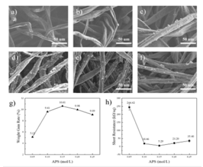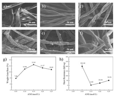 Figure 6a-f is the SEM diagram of the PANI / CFs electrode material prepared with different concentrations of ANI. As shown in Figure 6d, when the ANI concentration is 0.15mol/L, that is, the molar ratio between ANI and APS is 1:1, the loaded PANI on CFs is significantly better than the other concentrations. According to Figure 6g, the load of PANI on CFs first increases and then decreases with increasing ANI concentration. When the ANI concentration is 0.15mol/L, the weight gain rate of PANI / CFs electrode material can reach 12.43%. As shown in Figure 6h, the PANI / CFs electrodes did not show the conductivity when the ANI concentration was 0.05mol/L. When ANI concentration of 0.15mol/L, the square resistance drops to a minimum and later increases with increasing ANI concentration. According to the quantum chemistry theory, the longer the conjugated molecular chain is, the more likely it is to form charge carriers and facilitate the migration of charge carriers [14]. When the concentration of aniline monomer is large, the reaction system becomes sticky with the increase of reaction time and is prone to have side reactions, which is not conducive to the growth of the conjugated molecular chain of PANI, and the corresponding square resistance value is large and the conductivity is poor.