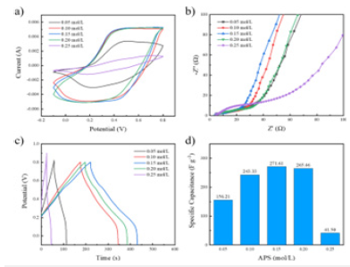 Electrochemical properties of the PANI / CFs electrode materials: Figure 4a is the CV curve of PANI / CFs electrode materials prepared with different concentrations of APS. As shown in Figure, when the scanning rate is 50mV / s, the area of CV curve increases with increasing APS concentration. The area of the CV curve reached its maximum when the APS concentration was 0.15mol/L. However, when the APS concentration continues to increase to 0.20mol/L and above, the area of the CV curve begins to decrease and the electrochemical performance decreases. This is because when the APS concentration is too low, there are not enough oxidants to participate in the reaction and the PANI yield is low. When the concentration of APS is too high, it will oxidize the polymer chain and break it into small molecules, resulting in the decrease of electrochemical properties. Figure 4b is the EIS curve of PANI / CFs electrode material. As shown in Figure, the curve shows a semicircular pattern in the high frequency area and a oblique line in the low frequency area. Where the high-frequency semicircle represents the charge transfer resistance, and the slope of the curve in the low-frequency region represents the ion diffusion resistance [13]. In the low frequency region, when the APS concentration is 0.05mol/L to 0.15mol/L, the semicircle becomes smaller and smaller, and when the APS concentration continues to increase to 0.25mol/L, the semicircle starts to increase instead, indicating that as the APS concentration increases, the interfacial charge transfer resistance decreases and then increases. In the high frequency region, the slope of the line shows the opposite trend to the semicircle in the low frequency region, and the slope first increases with the increase of the APS concentration. When the APS concentration increases to 0.15mol/L and above, the slope begins to decrease. When the APS concentration is 0.15mol/L, the semi-circle radius and the linear slope are larger, and the electrodes show more ideal capacitance performance. Figure 4c-d shows the GCD curves and the corresponding specific capacitance values of the PANI / CFs electrode materials prepared with different concentrations of APS, respectively. According to the Figure, the discharge time of PANI / CFs electrode material increases and then decreases with the concentration of oxidant APS. At the APS concentration of 0.15mol/L, 271.61Fg-1, The best electrochemical performance.