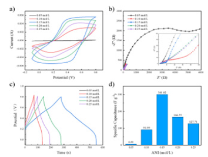 Electrochemical properties of the PANI / CFs electrode materials: Figure 7a shows the CV curves of the PANI / CFs electrode materials prepared at different ANI concentrations. As shown, at the ANI concentration of 0.05mol/L, the CV curve of the PANI / CFs electrode material shows no characteristic peak of the redox reaction. As the concentration of ANI increases to 0.15mol/L, the CV curve area of the electrode material is the largest, showing excellent electrochemical energy storage capacity. However, when the molar ratio of ANI to APS in the reaction system is greater than 1, the yield and mass of PANI decrease, reducing the charge transfer rate and electrochemical properties.