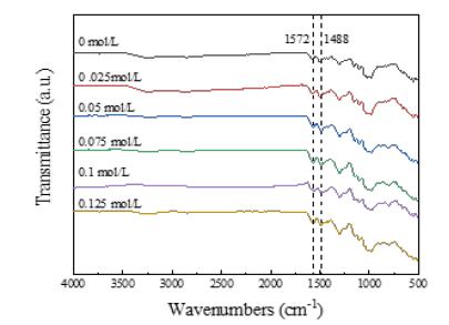 Morphological structure and electrical conductivity of PANI / CFs electrode materials: Different concentrations of HCl solution were used as the dopant (H+), Additional positive charge can be introduced into the PANI polymer chain, changing its band structure and affecting its electronic structure and electron transport properties [16], and improve the electrical conductivity. Figures 8 show the different concentrations of H+FT-IR plots of doped prepared PANI / CFs, as shown, with H+. Increased concentration, 1572cm-1, 1488cm-1. The PANI characteristic absorption vibration peak at the place tends to increase, but when H+After concentrations greater than 0.1mol/L, the characteristic absorption vibration peak of PANI weakens, indicating that within a range, H+. For the chain growth response of PANI.