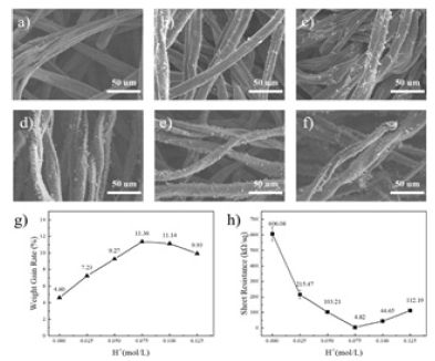 Figure 3:a) 0mol/L, b) 0.05mol/L, c) 0.1mol/L, d) 0.15mol/L, e) 0.2mol/L, f) 0.25mol / L, g) weight gain and h) square resistance map of PANI / CFs electrode material.
