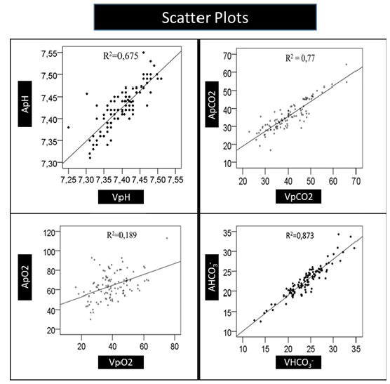 Numerous studies have been published on this topic. In their emergency department study comparing arterial and venous blood gas parameters, Bakoğlu et al. [1] reported a strong correlation between arterial and venous pH, pCO2 and HCO3⁻ values, while the correlation between pO2 and sO2 was weak. In a multicenter prospective study, Boulain et al. [4] examined the effectiveness of samples obtained from the central venous system in estimating arterial blood gas and lactate levels; they stated that venous pH, pCO2, sO2 and lactate values could be used-via various formulasto estimate arterial blood gas in cardiac patients, although the results were not perfectly concordant. Ak et al. [5] demonstrated that pH, pCO2, and HCO3⁻ values obtained from venous blood gas analysis reliably predicted arterial results in patients presenting with COPD exacerbation. Lemoel et al. [6] developed an approach to predict arterial values from venous blood gas using the SpvO2 parameter and reported a marked improvement in detecting arterial blood gas abnormalities when SpvO2 adjustment was added to raw data. In light of these findings, the aim of our study was to collect simultaneous arterial and venous blood gas samples from patients presenting to the emergency department with an indication for arterial blood gas analysis and to compare the pCO2, pO2, bicarbonate, and pH parameters; additionally, we sought to investigate the predictability of arterial values from venous parameters using mathematical formulas previously described in the literature.