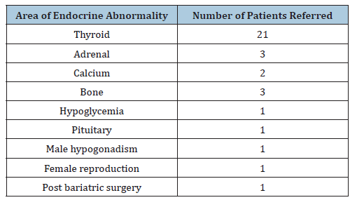 As I have expertise in most areas of endocrinology, patients with thyroid, adrenal, bone, reproductive or calcium problems are referred to me as well (Table 1). For these patients, I also take an extensive history and rely on the physical exam obtained by the clinic provider. For patients with thyroid disorders, I order thyroid ultrasounds at a local facility. For patients with osteopenia or osteoporosis, a DEXA bone density analysis is obtained, usually at a regional hospital. For patients with incidfental adrenal nodules, the patients go to a regional hospital for a CT scan.