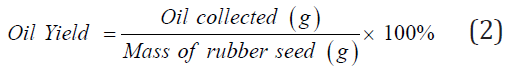 Bio-oil from RSS and RSK were extracted from the 10g of samples by soxhlet extraction using hexane as solvent at 60 °C for 6 hours [5]. All supernatants were collected and evaporated in a rotary evaporator to remove the solvent. The percent of bio-oil yield were calculated as below (2):