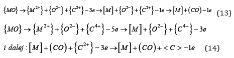 The presence of {C2+} ions in slag has recently been confirmed in laboratory tests. Adopting the concept of electronic structure of liquid metals, it should be assumed that oxygen forms an interstitial solution in liquid metals. It is believed that oxygen dissolved in the liquid metal does not exist in the atomic form [O] but in the form of the ion [O4+], while in the slag in the form of the {O2-} ion. The transition of oxygen from the liquid metal solution to the slag, based on the interaction of the double electric layer on the surface of the slag-liquid metal phase separation, in addition to overcoming the barriers resulting from surface interactions, requires taking six electrons from the double layer (reaction 10).