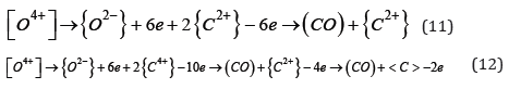 Based on the research, it was found that the interaction of solid carbides with slags according to reaction No. 4 is very low (about 1-2%). However, this reaction occurs much more intensively with the participation of nitrogen, especially when the reagent is in a liquid state (formula 5). Under appropriate conditions, carbides are dissolved in slags, occurring in oxygen-carbon and more low-melting joints with nitrogen-oxy-carbon systems. The basic change in this interaction will be dissociation, which can be written as follows: