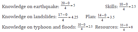 In terms of resources, majority (67%) of the population of the study belongs to the “poor” (0-25) category of preparedness. Although the overall mean is “fair” (10.69), this figure is still not acceptable considering dangers/threats posed by calamities. In this study resources are defined as the availability of materials that include disaster kit that contains bottled water, ready to eat foods, first aid kit, clothing, medications and gadgets including cellphones and radio with extra battery, and contact numbers needed during emergency.