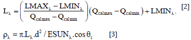 Preprocessing techniques including image-based radiometric, atmospheric calibration and several post-processing techniquessmoothing, aggregation, thresholding- were applied during various steps of analysis. Radiometric correction or calibration involved the conversion of the measured multispectral brightness or digital number (DN) values to top of atmosphere (TOA) reflectance units. Image-based radiometric calibration followed by two steps, firstly conversion of DN(Qcal) to radiance (Lλ) values and the next one is the conversion of radiance (Lλ) to reflectance (ρλ) values. The first step is based on maximal and minimal spectral radiance value for each band referred by Markham & Barker [6] based on the following formula (Equation 2). The second step followed by the Equation 3.