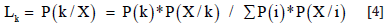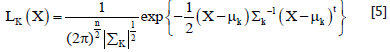 Where P(k) is the prior probability of class K and P(X/k) denotes the conditional probability to observe X from class k or probability density function. Usually, P(k) is assumed to be equal to each other and ΣP(i)*P(X/i) is also common to all classes. Therefore, Lk depends on P(X/k) or the probability density function. For mathematical reasons, a multivariate normal distribution is applied as the probability density function. In the case of normal distributions, the likelihood can be expressed as follows (Equation 5) (Study Groups, JARS, 1996).