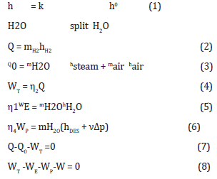 Equation (7) models the overall energy balance, with combustion heat (Q), gross electricity (WT), and rejected heat (Q0). Equation (8) models the electric balance, with gross electricity (WT), electrolysis energy (WE), water desalination and pumping (WP), and net electricity (W).