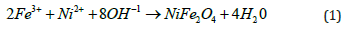 Ferric chloride hexahydrate (FeCl3.H2O), ferrous chloride tetrahydrate (FeCl2.H2O), nickel chloride hexahydrate (NiCl2.H2O) and ammonium hydroxide (NH4OH) were used for the preparation of Fe3O4 and NiFe2O4 superparamagnetic nanoparticles using coprecipitation method. Distilled water was used as a solvent to remove the impurities in the final product. Oleic acid was used as a surfactant [3]. First, the solution of NiCl2.6H2O was prepared in distilled water and stirrered for 1 hour at at 50 ℃ approximately. Then the solution of FeCl2.4H2O was prepared in the distilled water and stirrered for 1 hour at 50 ℃. Then solutions of NiCl2.6H2O and FeCl2.4H2O were mixed with continuous stirring at 70 ℃. Then NaOH was added drop wise upto pH 12. Oleic acids were added in the same solution as a capping agent and surfactant. The precipitation was washed out with distilled water and dried in the oven at 80 ℃ for 6 hours. The synthesized nickel ferrites were grinded into a fine powder. The chemical reaction of the NiFe2O4 has been mentioned as in equation-1.