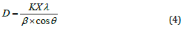 Where D represents the crystallite size of the diffraction peak, K represents the shape factor of the particles which is 0.9, λ is the wavelength of the radiation has the value 1.54 Å,β is the full width at half maxima of the diffraction peak, and θ is the corresponding Bragg’s diffraction angle Table 2.