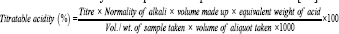 Titratable acidity was estimated by titrating a known volume of the sample against standard 0.1N NaOH solutions by using phenolphthalein as an indicator up to the end point (pink colour). The titratable acidity was expressed as per cent citric acid [10].