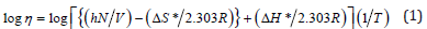 where η: dynamic viscosity; h: Plank’s constant; N: Avogadro’s number; V: molar volume of the solvent; R: universal gas constant; T: absolute temperature. The enthalpy of activation (ΔH) values were calculated from the slope [ln(1-C) vs 1/T]. The Gibbs’s free energy of activation (ΔG) was calculated using the following equation