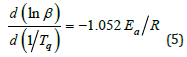 lnβ versus 1/Tq can be plotted to obtain the slope of the line as Ea/nR=7.884. Further, the reaction order in curing can be calculated being n=0.892 when substitute Ea=58.454kJ/mol and R into Ea/nR. The apparent activation energy of the curing reaction can also be calculated being Ea=62.428kJ/mol by the Ozawa equation of Eq.5.