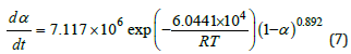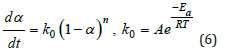 It is higher than the ΔE obtained by the Kissinger method. The Ea calculated by the Kissinger method and the Ozawa method is averaged Ea=60.441kJ/mol. Besides, the reaction degree (α) varies with time at certain heating rate, which can be described by the kinetics models (Figure 4). Among them, one phenomenological model of the n-order kinetics is mostly adopted as Eq.6.