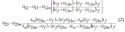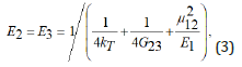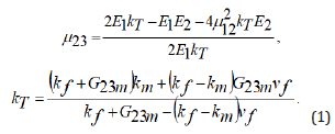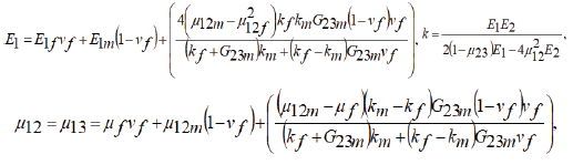 where indices f, m refers to fibers and matrix, respectively, ν– the mass fraction, μ–Poisson’s ratio, k–the bulk modulus at plane strain, kT–the effective composite modulus, in-plane shear modulus G12, G13 (2):