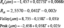 Equations that describe mathematically Ra, Rz and Rms presented statistically meaningful dependence. They show the small S of the models. Models of Rsk, Peak and Valley did not present an R-sq value sufficiently high to be considered a good fit.