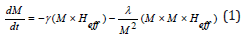where M is the magnetization; Heff=-∇M E is the effective field, E is the magnetic free energy; λ is a relaxation frequency related to the viscous damping of the magnetization; and γ=1.4gMn (GHz/ KOe) is the gyromagnetic ratio for Mn. If our system is considered as a collection of magnetically oriented grains or particles, then the magnetic free-energy can be expressed as