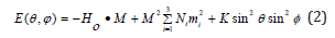 where the first term is the Zeeman energy at a magnetic field H0, Ni are the demagnetizing factors of the material, mi the director cosines of the magnetization M in spherical coordinates, the third term is the anisotropy energy with anisotropy constant K, and (θ, φ) are the spherical angles. At equilibrium, (θ =θ0,φ =ϕ0), the LLGE has the periodic solution M exp(iωt), where ω is the resonance frequency given by the condition [17].