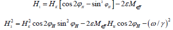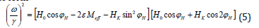 Here, EKƟƟ, EKϕϕ, EKƟϕ are the angular derivatives of the anisotropy energy evaluated at the equilibrium positions. Suppose now that our system consisted in arranged single domain uniaxial particles (grains) in the form of ellipsoids of rotation (N1=N2=N⊥; N3=N|| with saturation magnetization M=N0μ0/V0, being μ0 and V0, the particle moment and particle volume, respectively, and anisotropy energy given by EK= K sin2ƟƟ sin2ϕ. The field is applied in the xy-plane parallel to the plane of the sample (ƟH=π/2), with the magnetization along the uniaxial axis. At resonance, the magnetization follows approximately the external field so the equilibrium angles are Ɵ0≅ π/2, ϕ0≅ϕH so equation (4) is simplified to the form