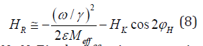 According to this, the resonance field is uniquely determined in the range from ϕ0=ϕH=0 (easy uniaxial axis) to ϕ0=ϕH=π/2 (hard uniaxial axis), such that HR (0)≤ HR(ϕH)≤ HR (π/2). In the case when the condition 4πMeff>>Hk is fulfilled, the FMR field is purely uniaxial and given by the simplified form