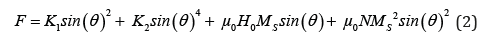 When the field is applied along the easy-axis of magnetization (Figure 6), the free displacement of the walls leads to the disappearance of the domains, as soon as the applied field is greater than Ms/3, all the magnetic moments are orienting themselves to the magnetic field direction and consequently the macroscopic magnetization is then equal to the microscopic magnetization Ms=0.0380T with a remnant magnetization of Mr=0.036T. When the field is applied on the hard-axis of magnetization, no domain being favored therefore their volume does not change. The magnetization of each of them turns at the same angle by reason of the anisotropy energy which is very important in this axis. For the saturation field of μ0Hs=1.5T, we reach a magnetization of M=0.0372T less than the saturation magnetization Ms, to arrive at the same value of the saturation magnetization, it is necessary to apply an external field called anisotropy field HA (see Eq. 6), as shown in the Figure 6 this field equal to μ0HA=1.7T where it is much larger than the saturation field in order to overcome the anisotropy energy on this axis.