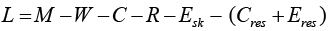 Where M(W/m2) is the internal energy production, W(W/m2) is the external work, C(W/ m2) is the heat loss by convection, R(W/m2) is the heat loss by thermal radiation Esk (W/m2) is the heat loss by evaporation of the skin, Cres(W/m2) and Eres(W/m2) are the sensible and the evaporation heat loss due to respiration respectively.