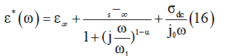 Where εs is the static permittivity, ε∞ is the permittivity at infinitely high frequencies, ε0 is the permittivity of the free space, ω1 is the relaxation angular frequency of the Debye process, α is the Cole-Cole parameter and ζdc represents the specific conductivity.