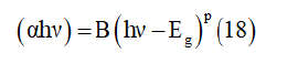 Where α is the absorption coefficient, (hν) is the incident photon energy, B is a constant characteristic of the material and p is equal to 2 for an indirect transition ( plotted as (ahν)1/2 as function hν (Figure 13) or p is equal ½ for a direct transition ( plotted as (ahν)2 as function hν (Figure 13)