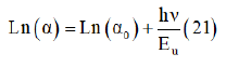 Therefore, the value of Urbach energy (EU) can be calculated from the inverse of the slope of the straight line of plotting Ln (α) as function he incident photon energy (hν) (Figure 14) which is equal 0.395eV.