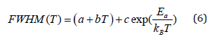 To verify that the phase transitions are correlated with changes of the [N(C3H7)4]+ groups, we followed the analysis of the full width at half maximum (FWHM), which is based on the theory used for the damping associated with an order-disorder mechanism. The analysis of the full width at half maximum (FWHM) described by Carabatos-Nedelec and Becker was followed [23]. The temperature dependence of the band-width is described by [24].