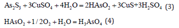 Copper sulfate replacement with the air oxidation process: The replacement reaction between copper sulfate and arsenic sulfide produces arsenious acid HAsO2 which has a low solubility. It is oxidized to arsenic acid whose solubility in the leaching solution increases if the air is bubbled through the solution. The process takes place at room temperature and atmospheric pressure which ensures safety and enhanced reliability. The process technology is mature, but the processing cost is high due to the complexity of the process [5,6].