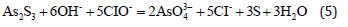 Sodium hypochlorite oxidation leaching process: Arsenic can be effectively removed from arsenic sulfide slag by sodium hypochlorite solution [7] since CIO- and OH- ions in the solution effectively oxidize and dissolve arsenic. The removal of arsenic by oxidation with sodium hypochlorite solution effectively accelerates the reaction to time durations of less than 10min and the reaction is not sensitive to the temperature. The processes of desulfurization and arsenic leaching take place in a single step which makes the process simple and increases the production efficiency.
