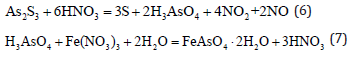 Oxidation leaching using ferric sulfate: Oxidation leaching of ferric sulfate is a method of leaching arsenic sulfide with ferric sulfate under high pressure [3]. Using Fe2(SO4)3 as the oxidizing agent, trivalent arsenic is oxidized to pentavalent; the reaction takes place under high pressure. The processed Fe2(SO4)3 can be recycled after oxidation which reduces the production cost. However, due to the high-pressure requirement, the production equipment is expensive and the process is complicated. The main reactions are as follows: