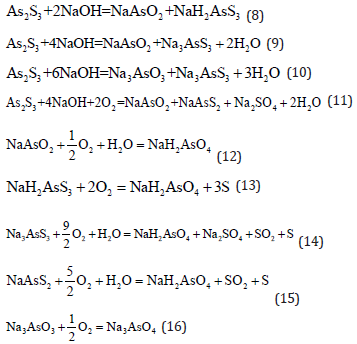 Alkali leaching with air oxidation: The arsenic sulfide can be leached by NaOH alkali solution at 70-80 ℃. After solid-liquid separation, the air is injected for oxidation [10]. The advantages of the process are: (i) air is used as the oxidant and (ii) the alkali can be regenerated which reduces the production cost. The reactions which take place are the following: