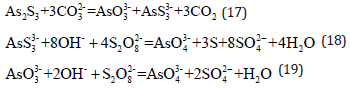 Alkaline leaching using sodium carbonate and sodium persulfate: Arsenic present in Cu-As filter cakes can be leached using sodium carbonate solution [11] and the efficiency of arsenic elution exceeds 96%. Arsenic in the leaching solution primarily exists in the form of arsenate and thioarsenate. Trivalent arsenic is oxidized to pentavalent and sulfur is oxidized to its elemental form by adding sodium persulfate to the leaching solution. The reactions are as follows: