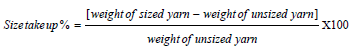 Sizing process: The warp yarns were sized in a conventional cylinder sizing machine with 9 drying cylinders. During sizing, all the parameters including the machine used, its speed (30-40m/ min), yarn tension, squeezing roller pressure (2kg/cm2), yarn stretch percentage (1-1.2%), total number of ends (3986) were kept constant. Equal amount of moringa and maize are used for solution preparation. Solution was prepared and cooked as given in Table 2. Viscosity (flows per second) of the prepared solution was measured using the zahn cup and converted to ASTM standard unit of centistokes. The viscosity result indicated that moringa starch solution achieved a viscosity of 15 flows/sec. Size take up percentage was calculated using equation (i).