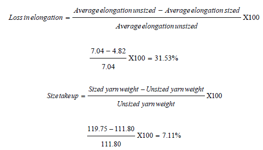 Where, Ss: Sized yarn strength; Su: Unsized yarn Strength (Table 2).